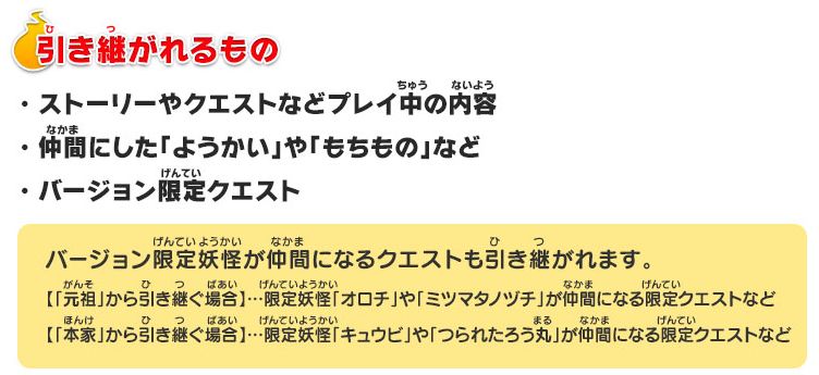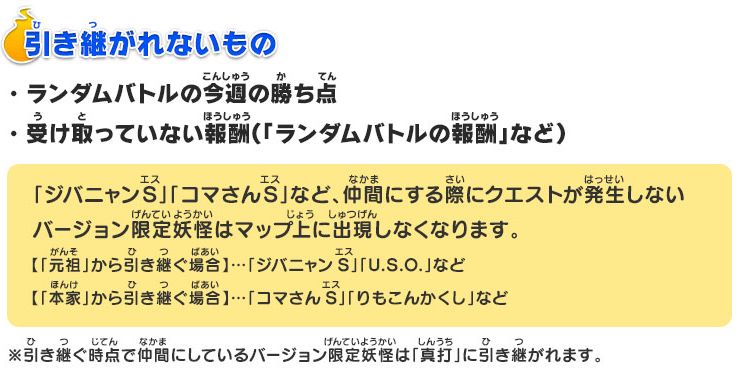 あくまでも引継ぎで出現するのは「クエスト」で入手できる妖怪です。
