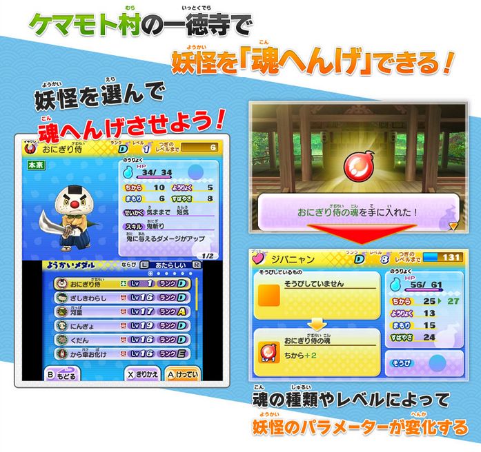 妖怪を「魂へんげ」させて別の妖怪に装備することで強化出来る!